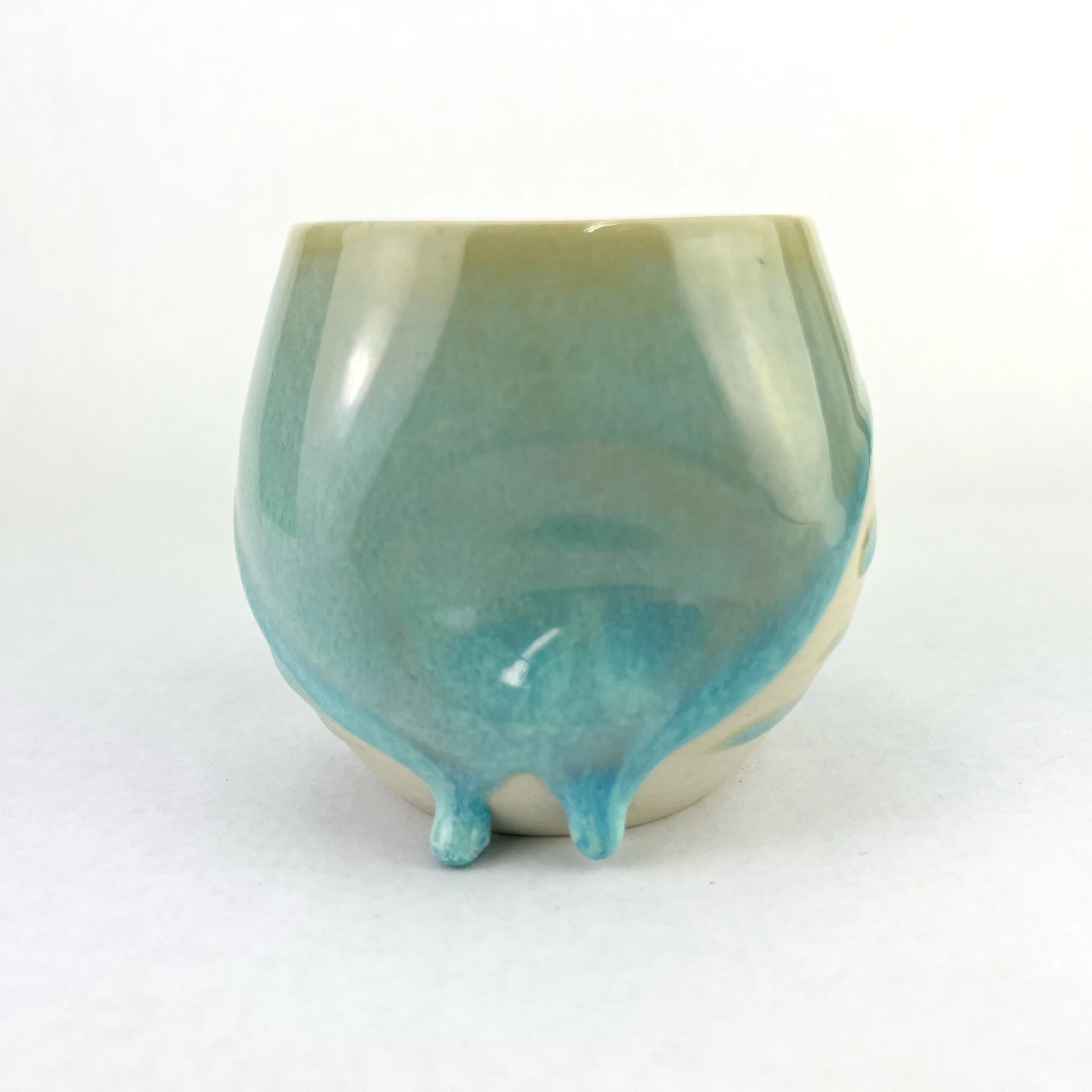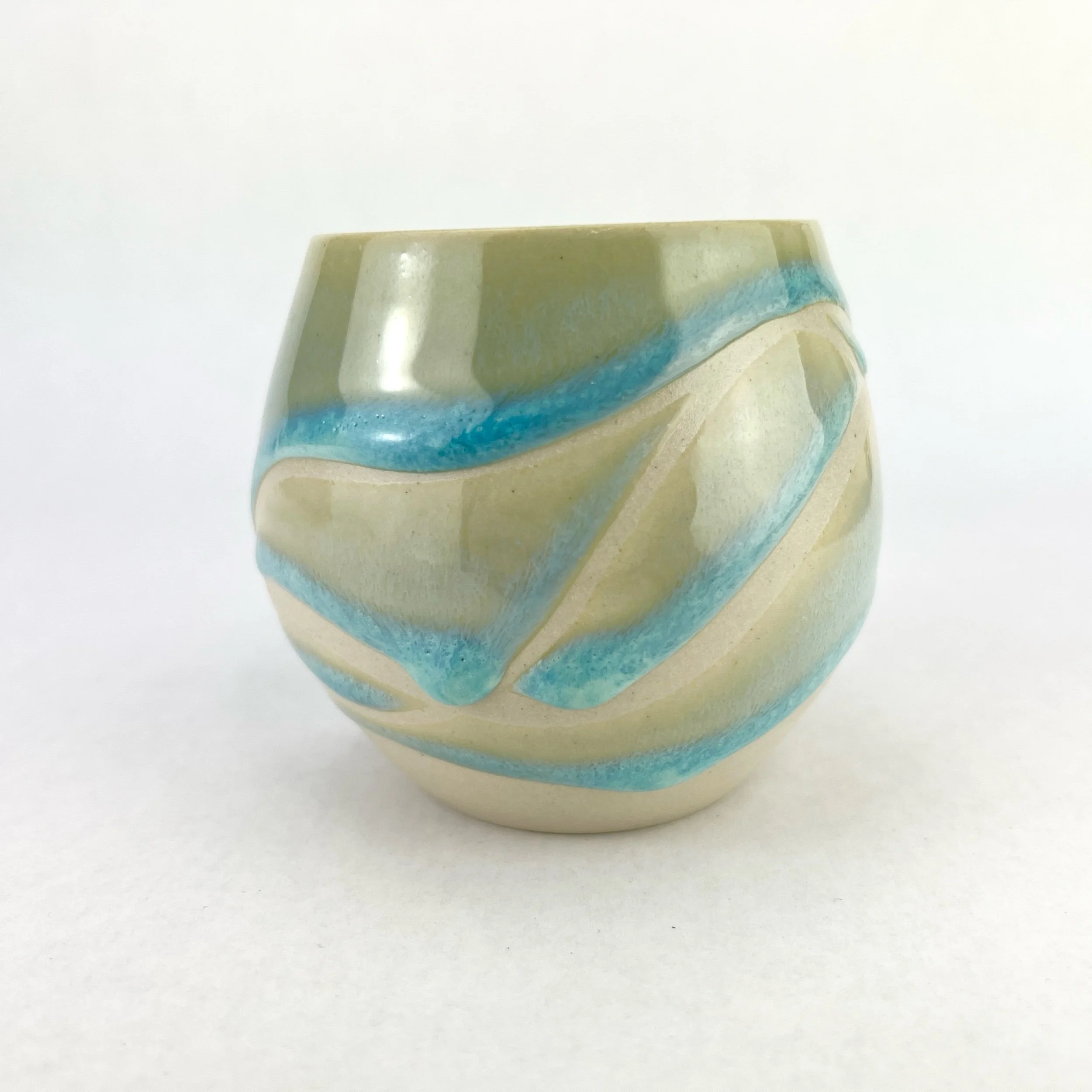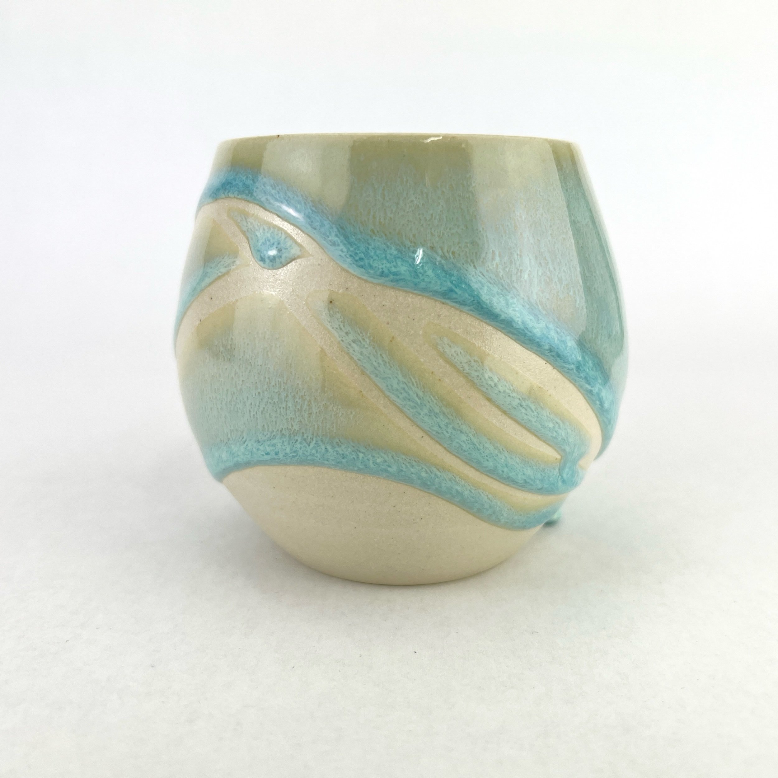 These tumblers are thrown and trimmed by hand. Each design is intuitively created on each piece every time. The details below are approximate since each tumbler is uniquely crafted.