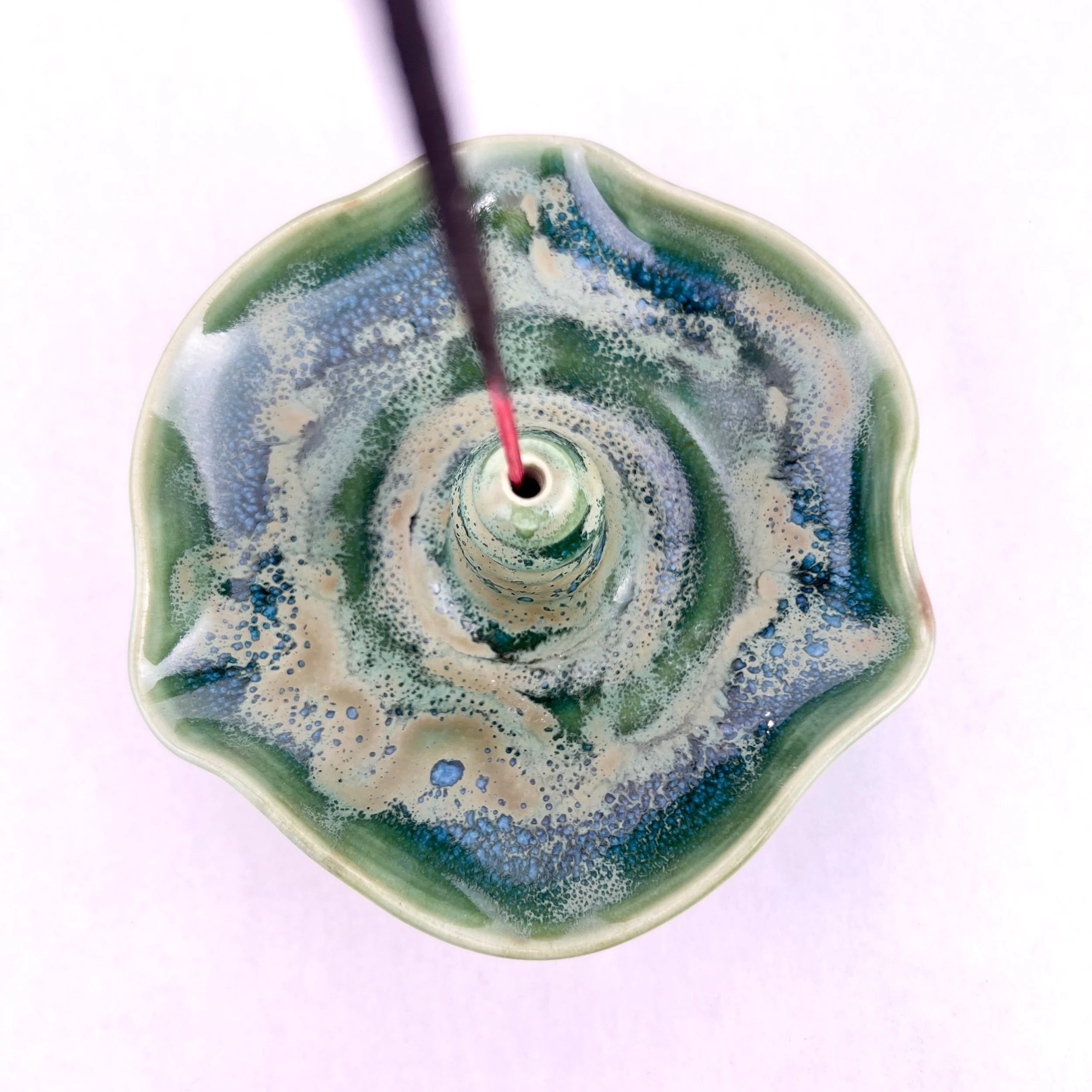 These incense holders are thrown and trimmed by hand. The details below are approximate since each incense holder is uniquely crafted.