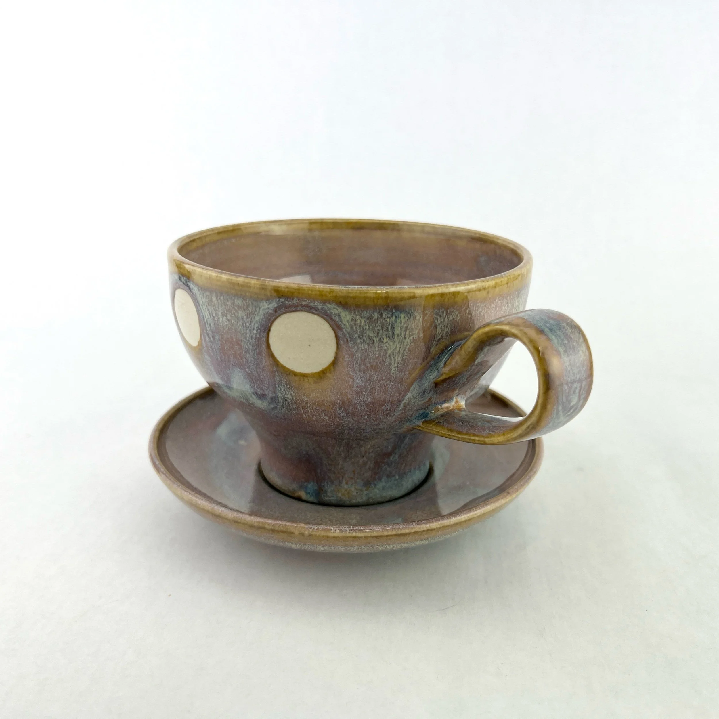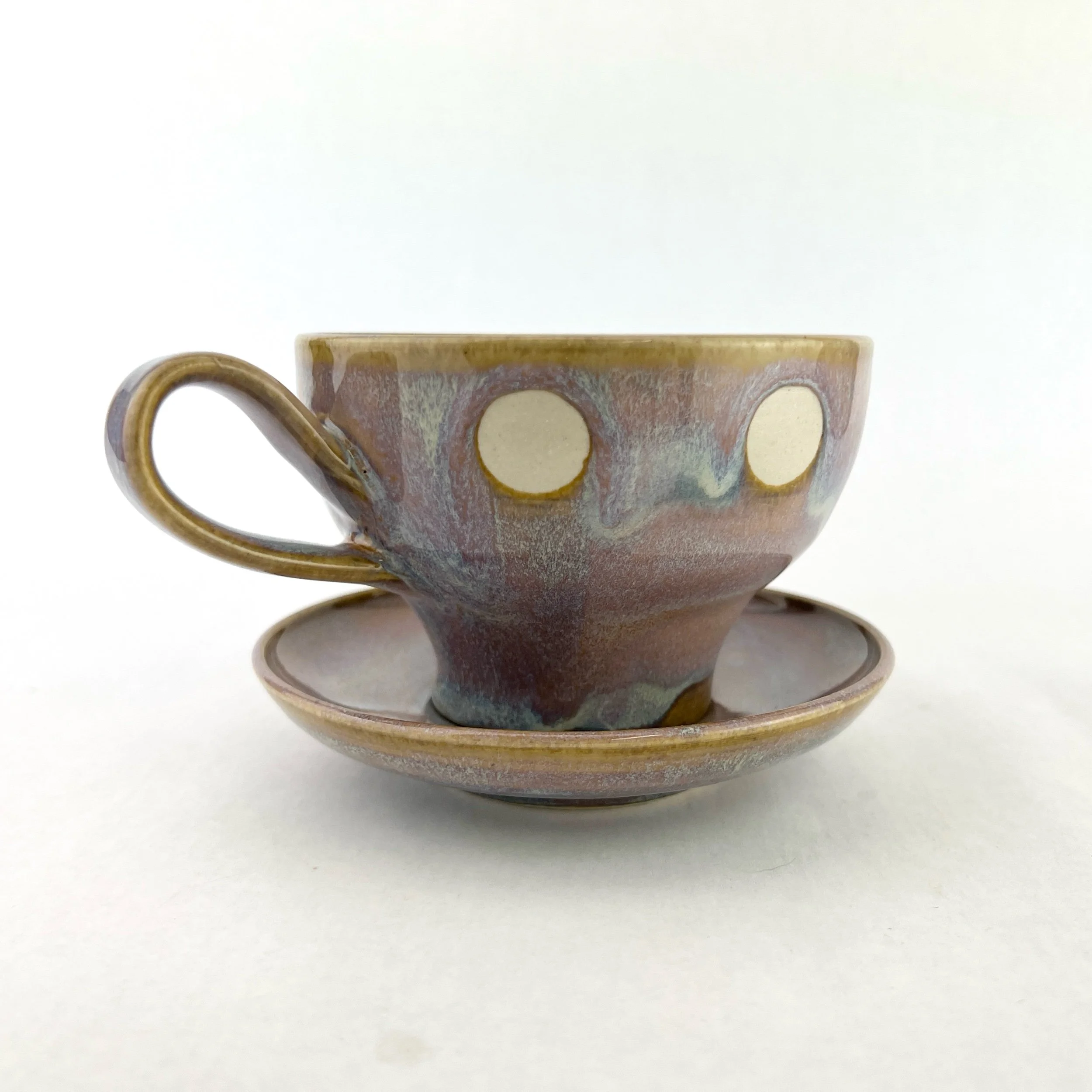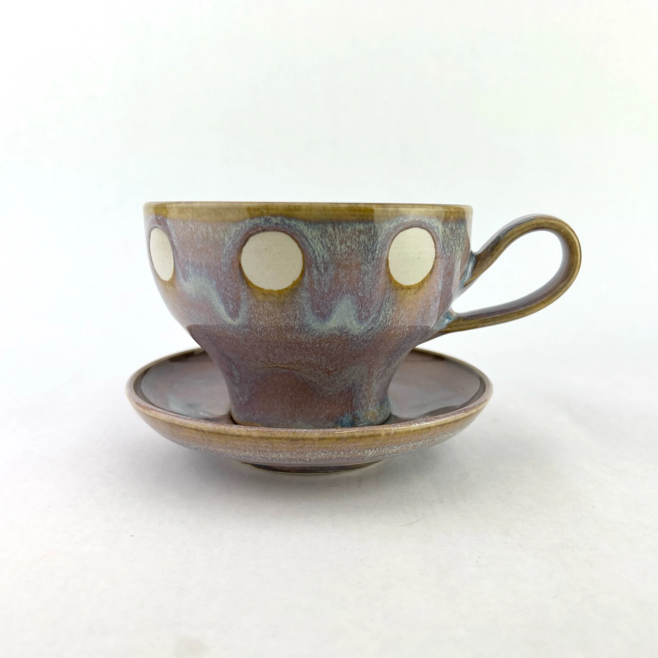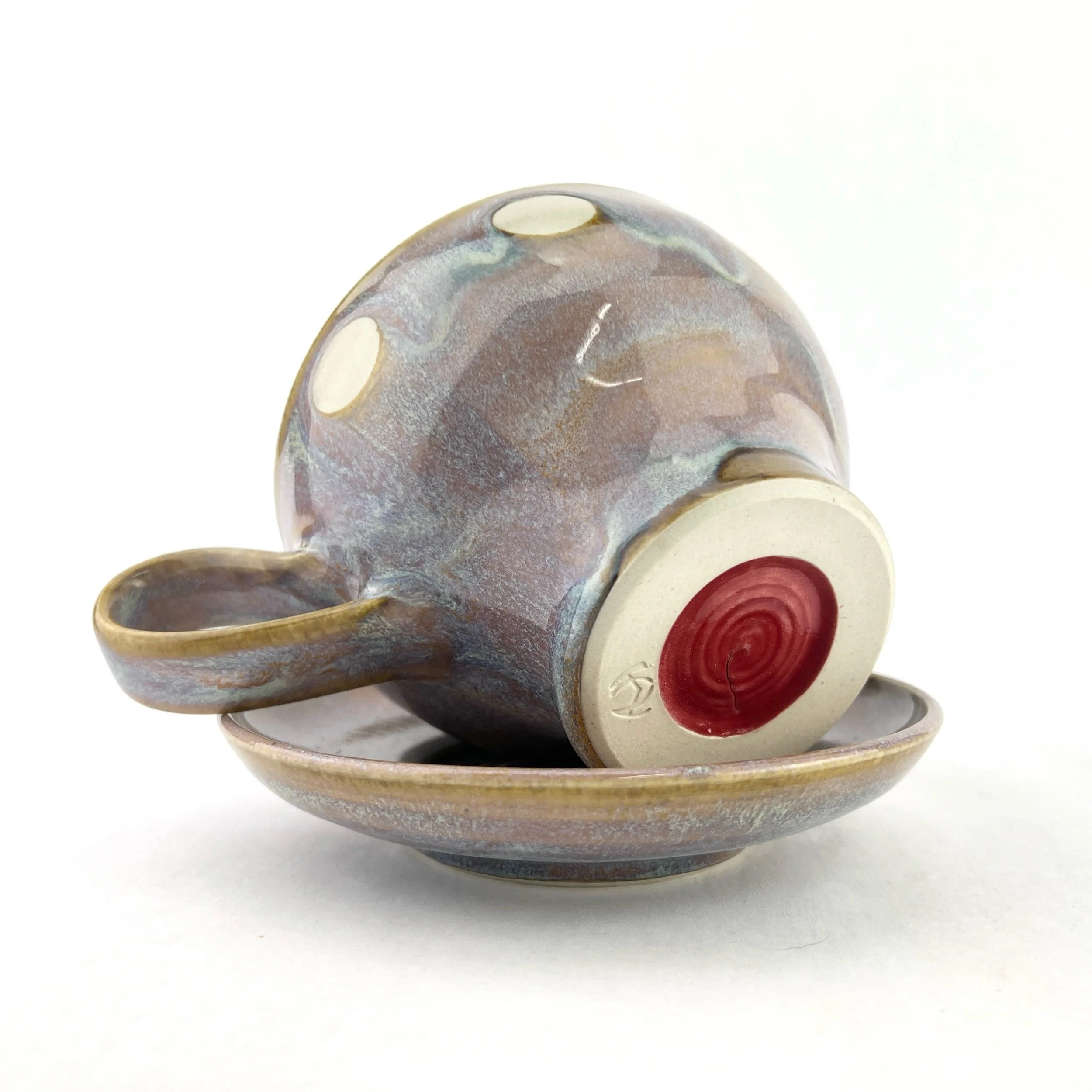 The cup and saucer are thrown and trimmed by hand. Each design is intuitively created on each piece every time. The details below are approximate since each set is uniquely crafted.