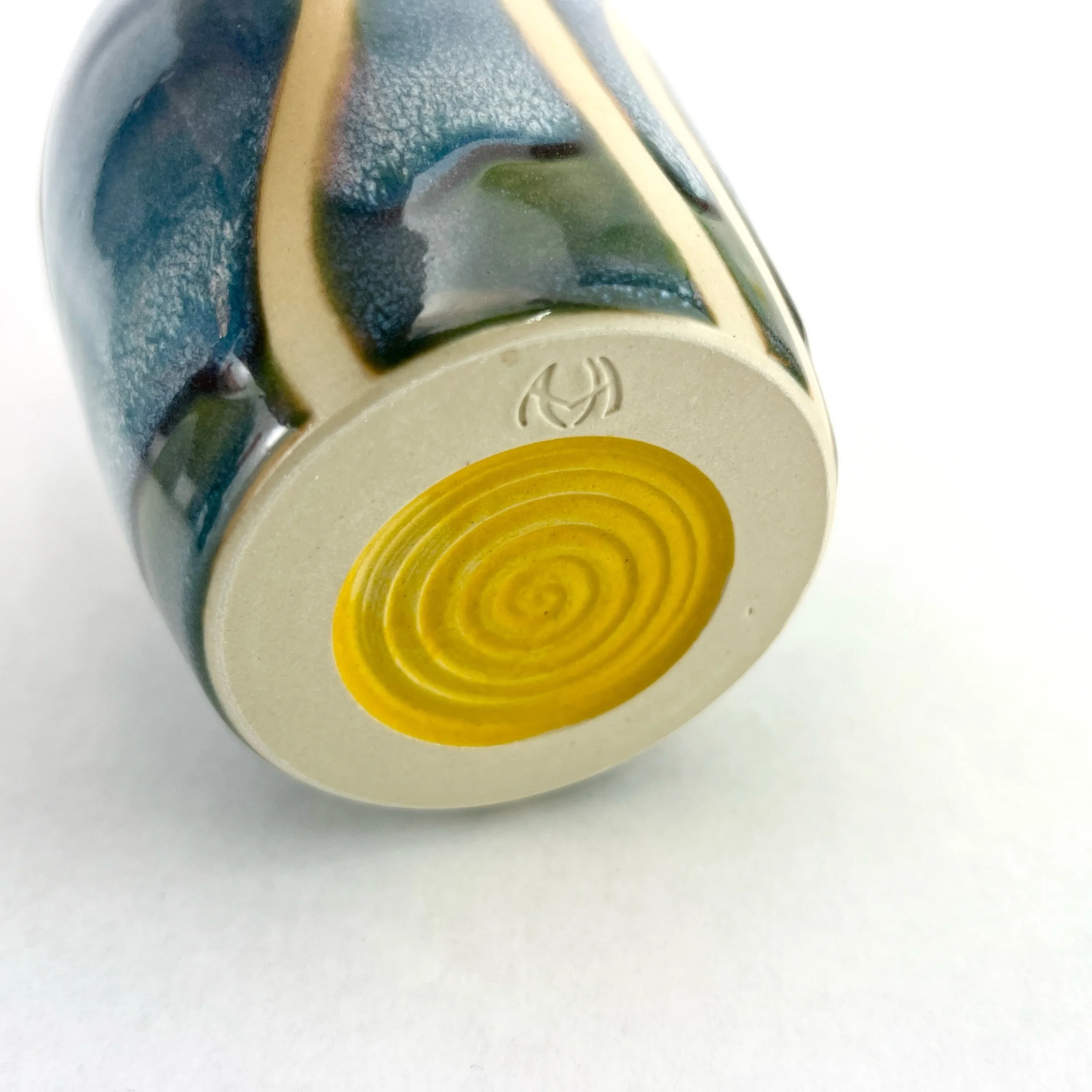 These bottles are thrown and trimmed by hand. Each design is intuitively created on each piece every time. The details below are approximate since each oil bottle is uniquely crafted.