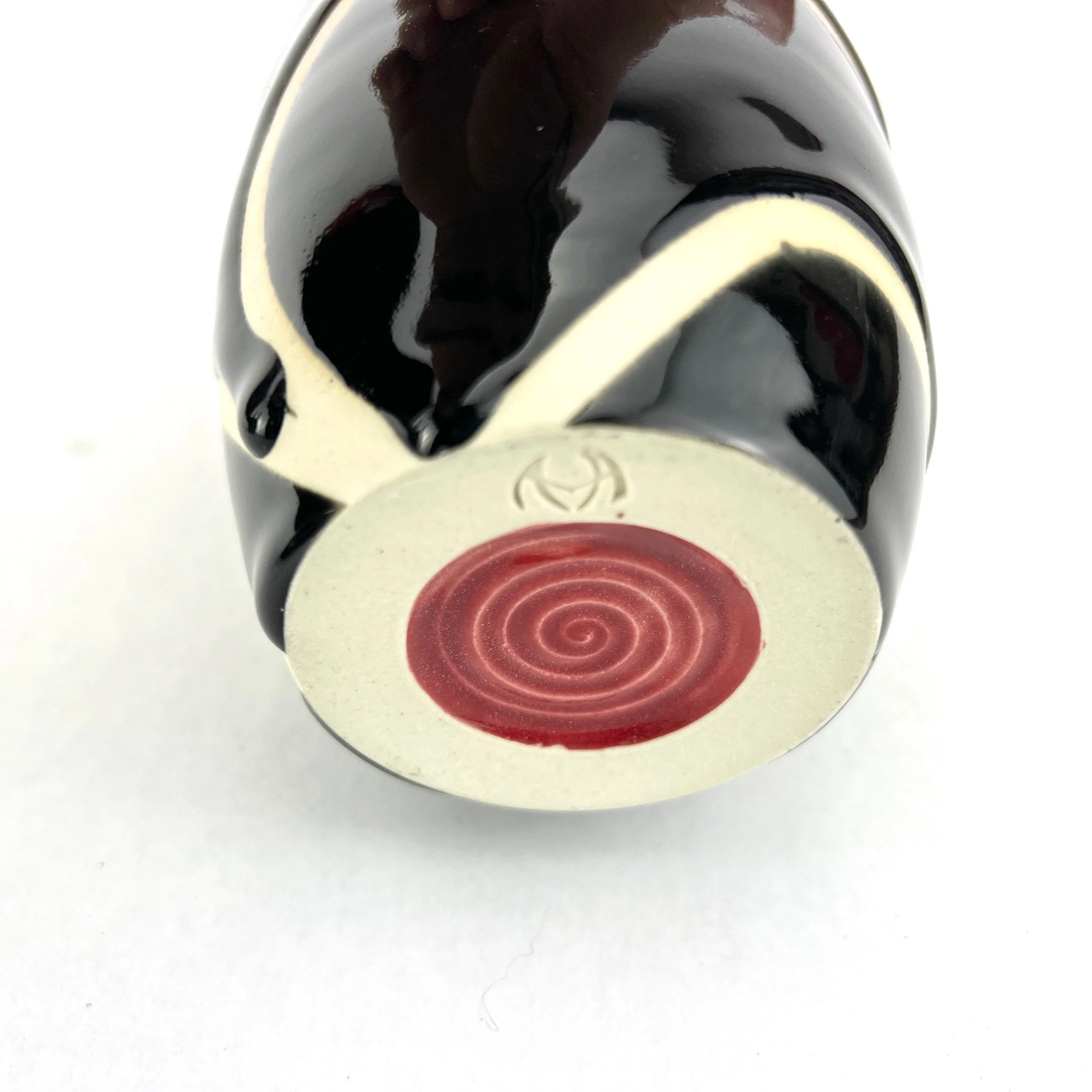 These bottles are thrown and trimmed by hand. Each design is intuitively created on each piece every time. The details below are approximate since each oil bottle is uniquely crafted.