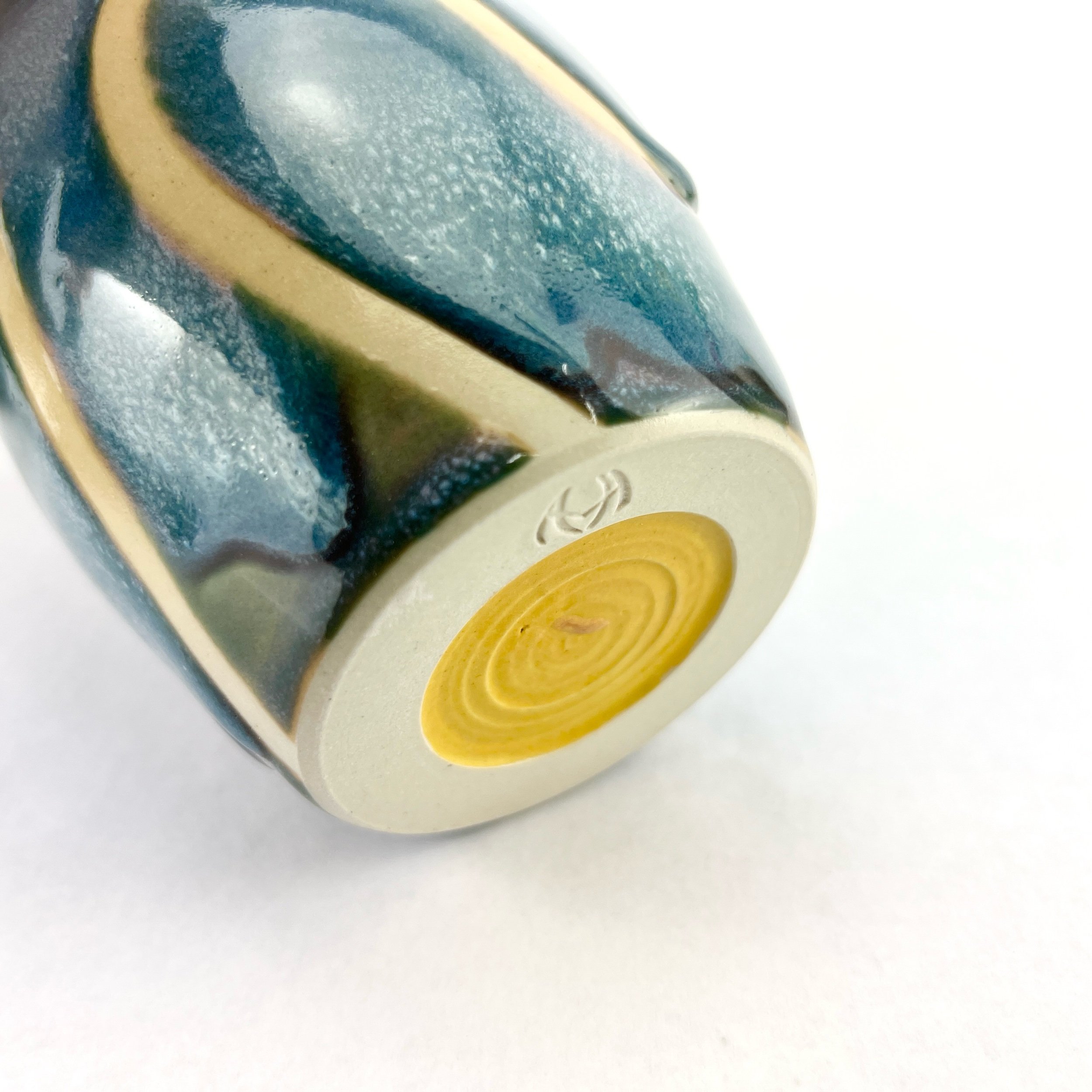 These bottles are thrown and trimmed by hand. Each design is intuitively created on each piece every time. The details below are approximate since each oil bottle is uniquely crafted.