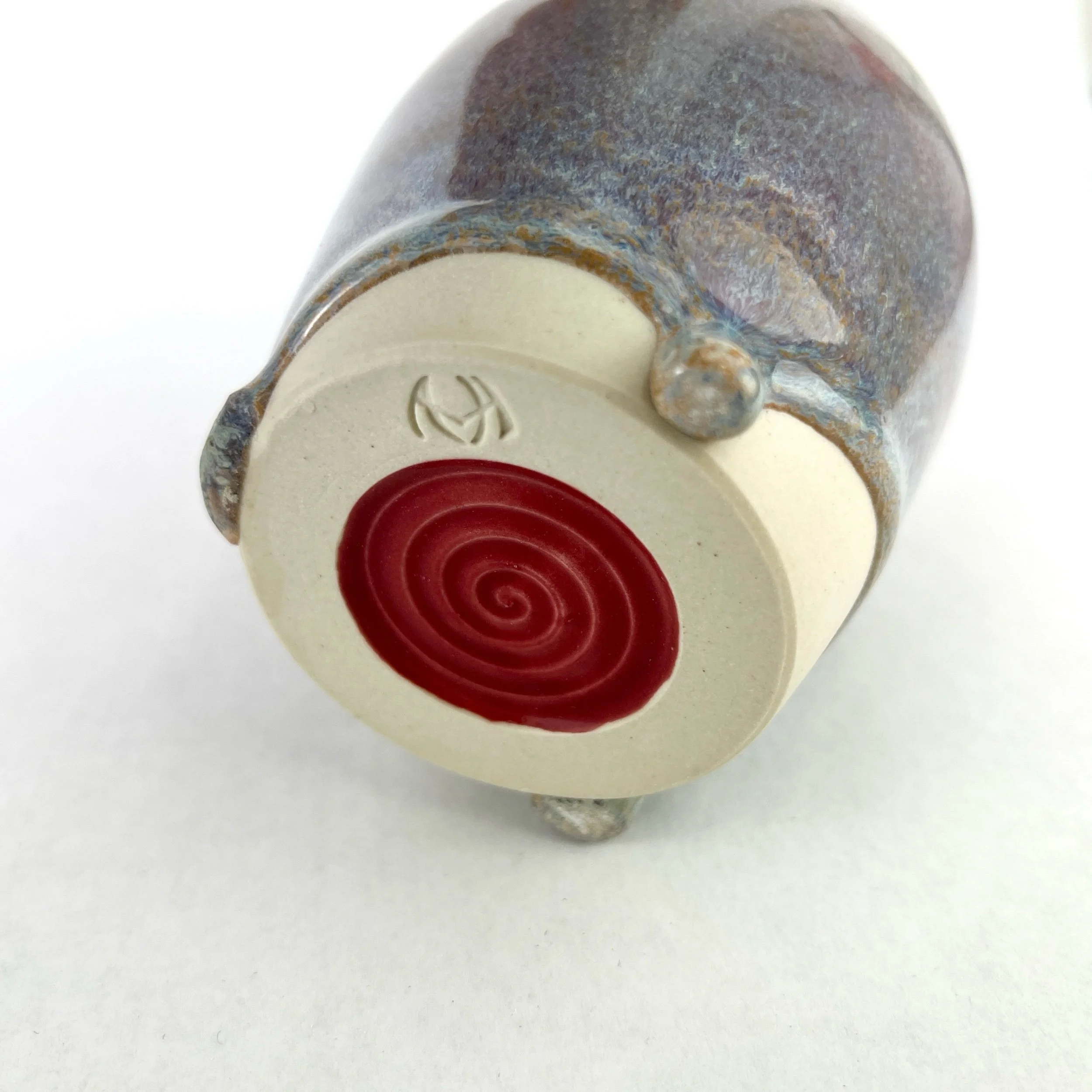 These bottles are thrown and trimmed by hand. Each design is intuitively created on each piece every time. The details below are approximate since each oil bottle is uniquely crafted.