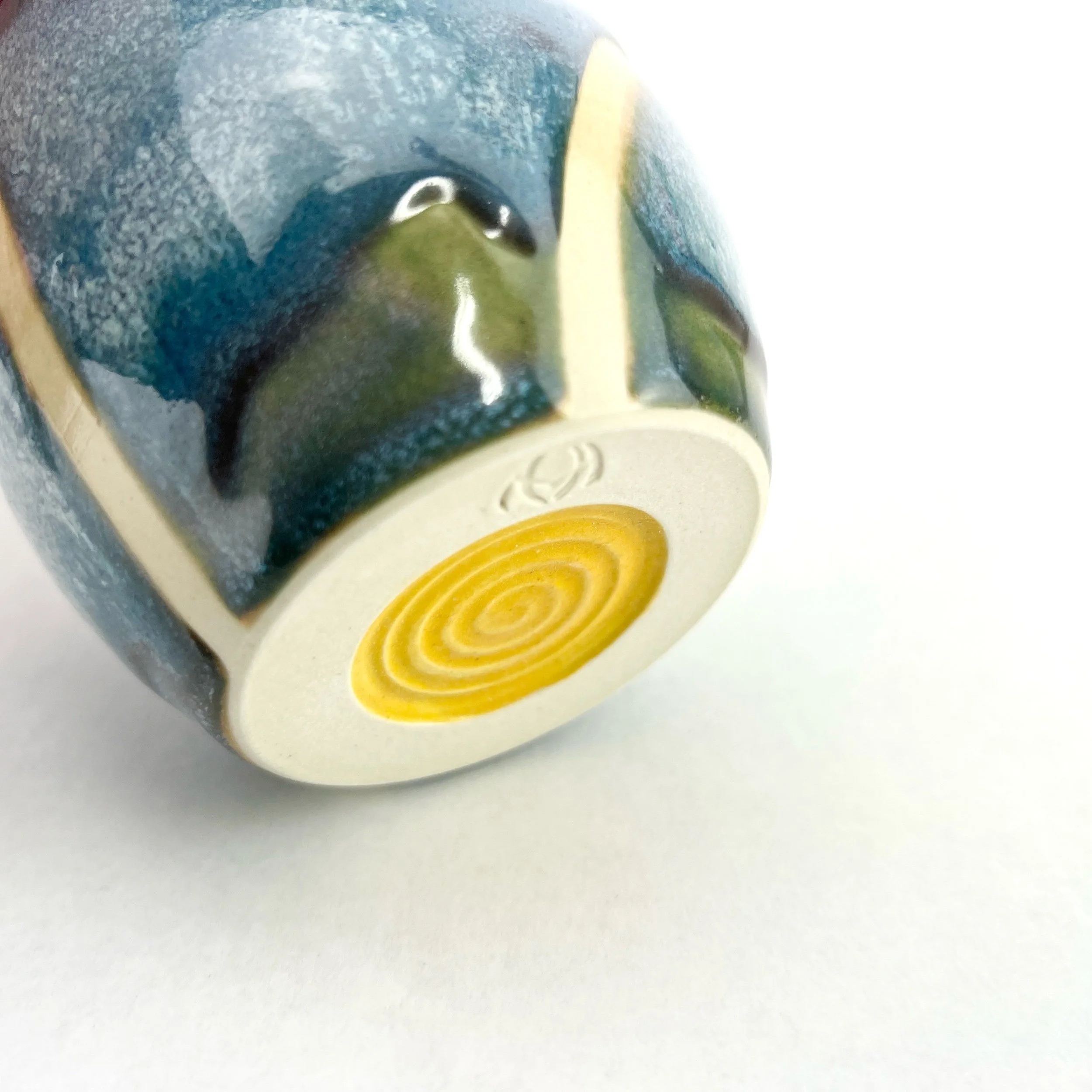 These bottles are thrown and trimmed by hand. Each design is intuitively created on each piece every time. The details below are approximate since each oil bottle is uniquely crafted.