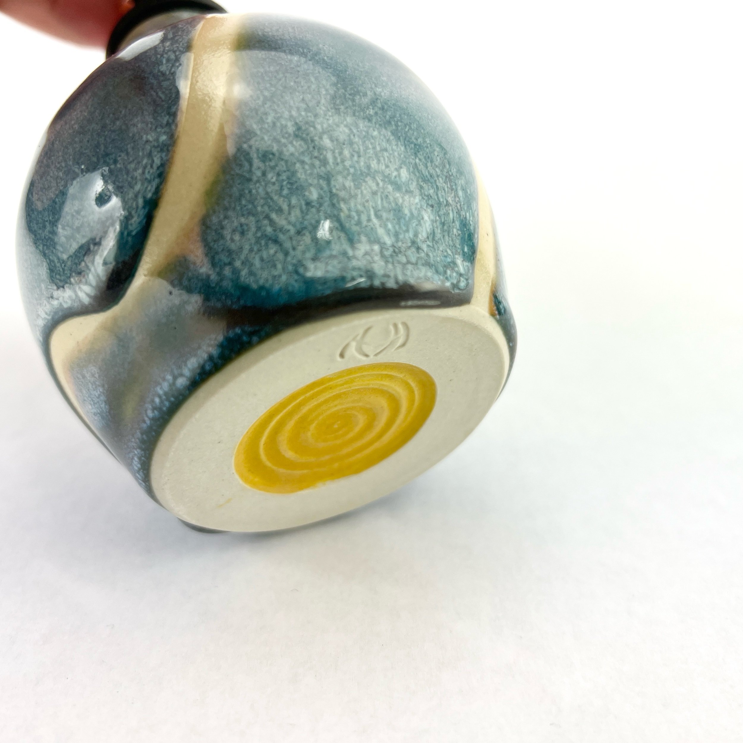 These bottles are thrown and trimmed by hand. Each design is intuitively created on each piece every time. The details below are approximate since each oil bottle is uniquely crafted.