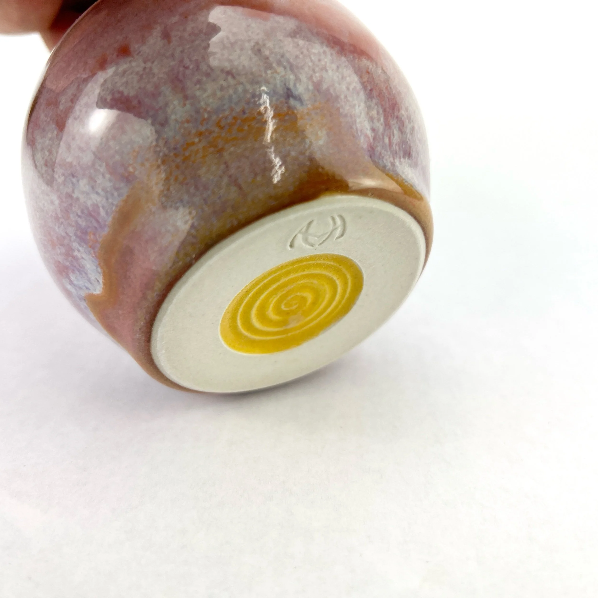 These bottles are thrown and trimmed by hand. Each design is intuitively created on each piece every time. The details below are approximate since each oil bottle is uniquely crafted.