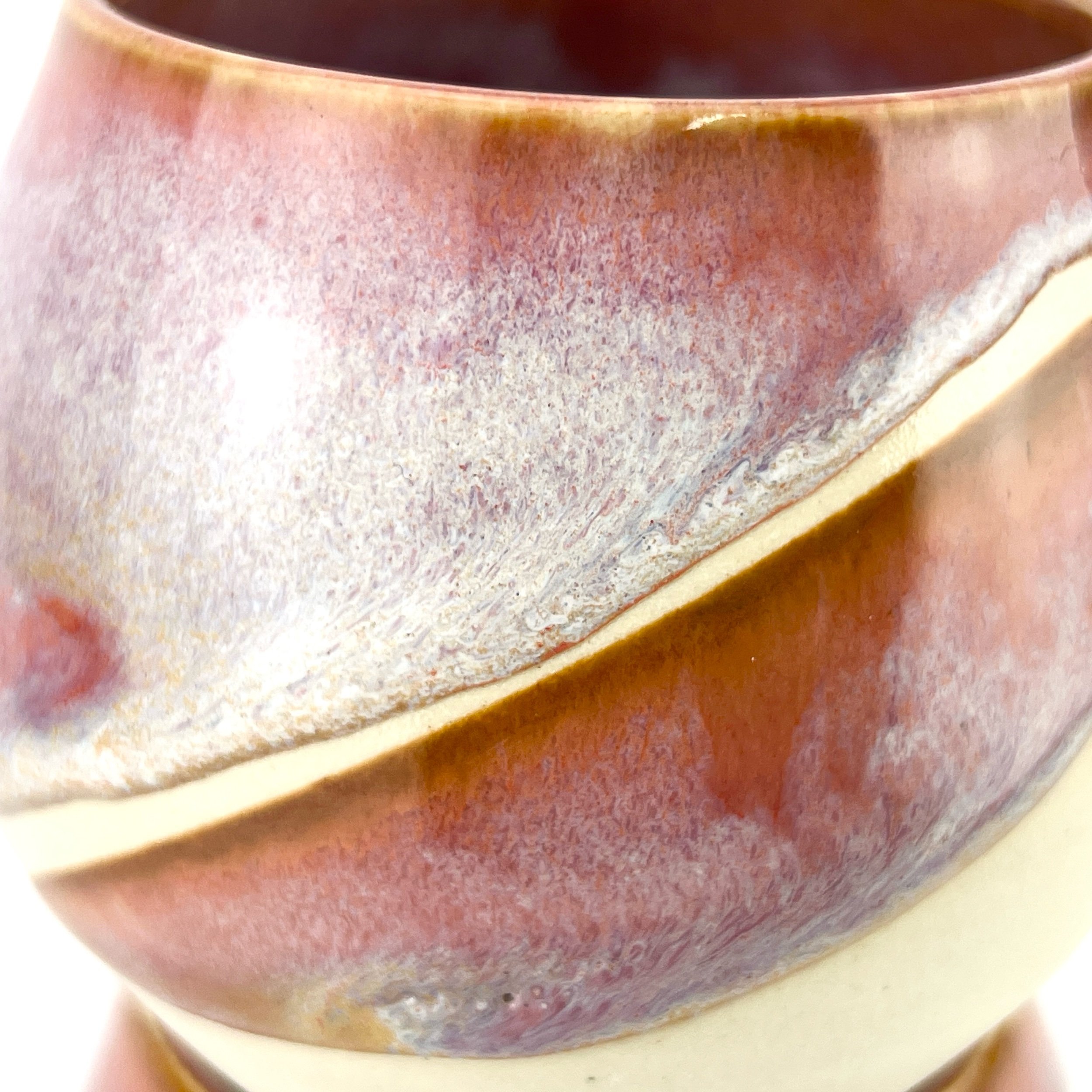 These tumblers are thrown and trimmed by hand. Each design is intuitively created on each piece every time. The details below are approximate since each tumbler is uniquely crafted.