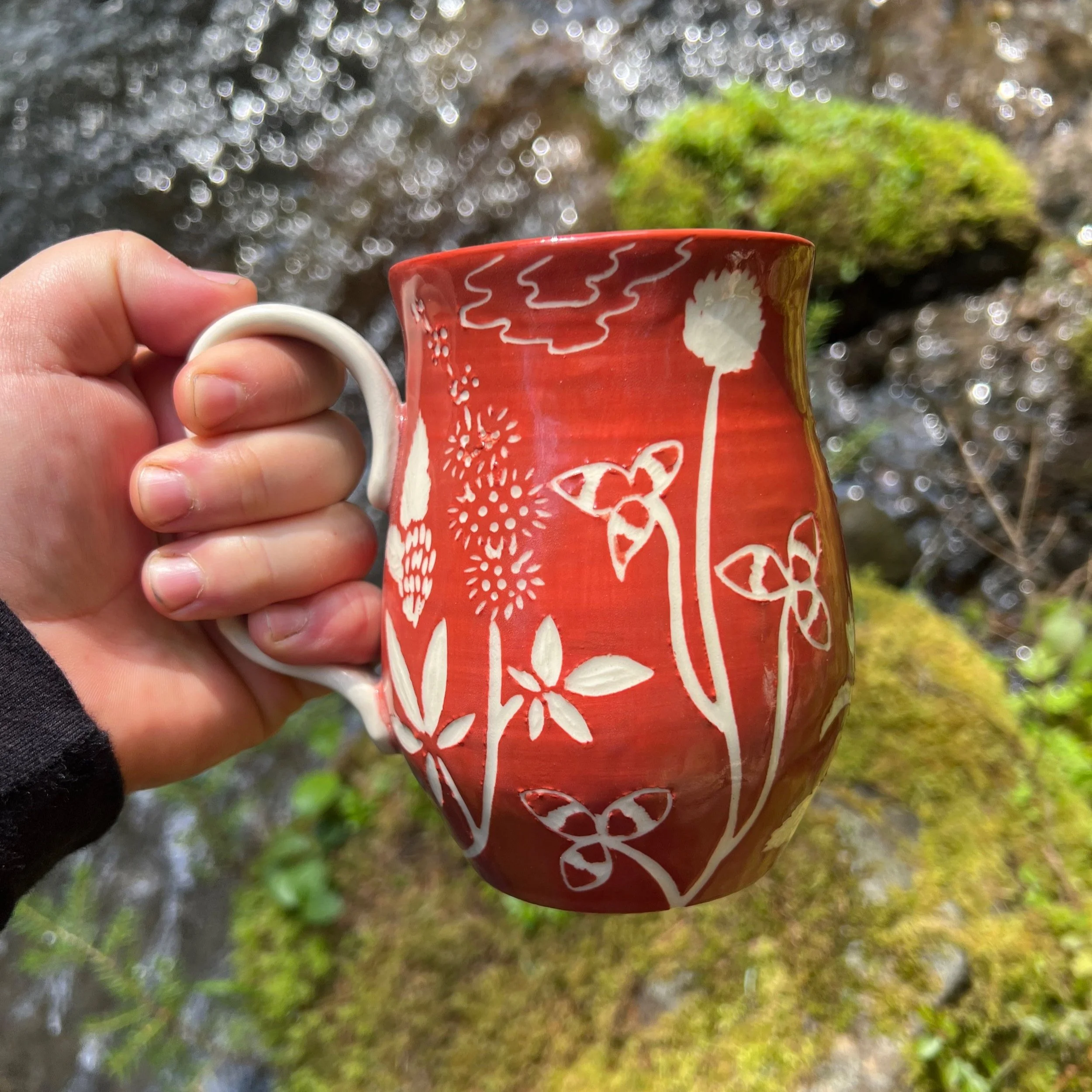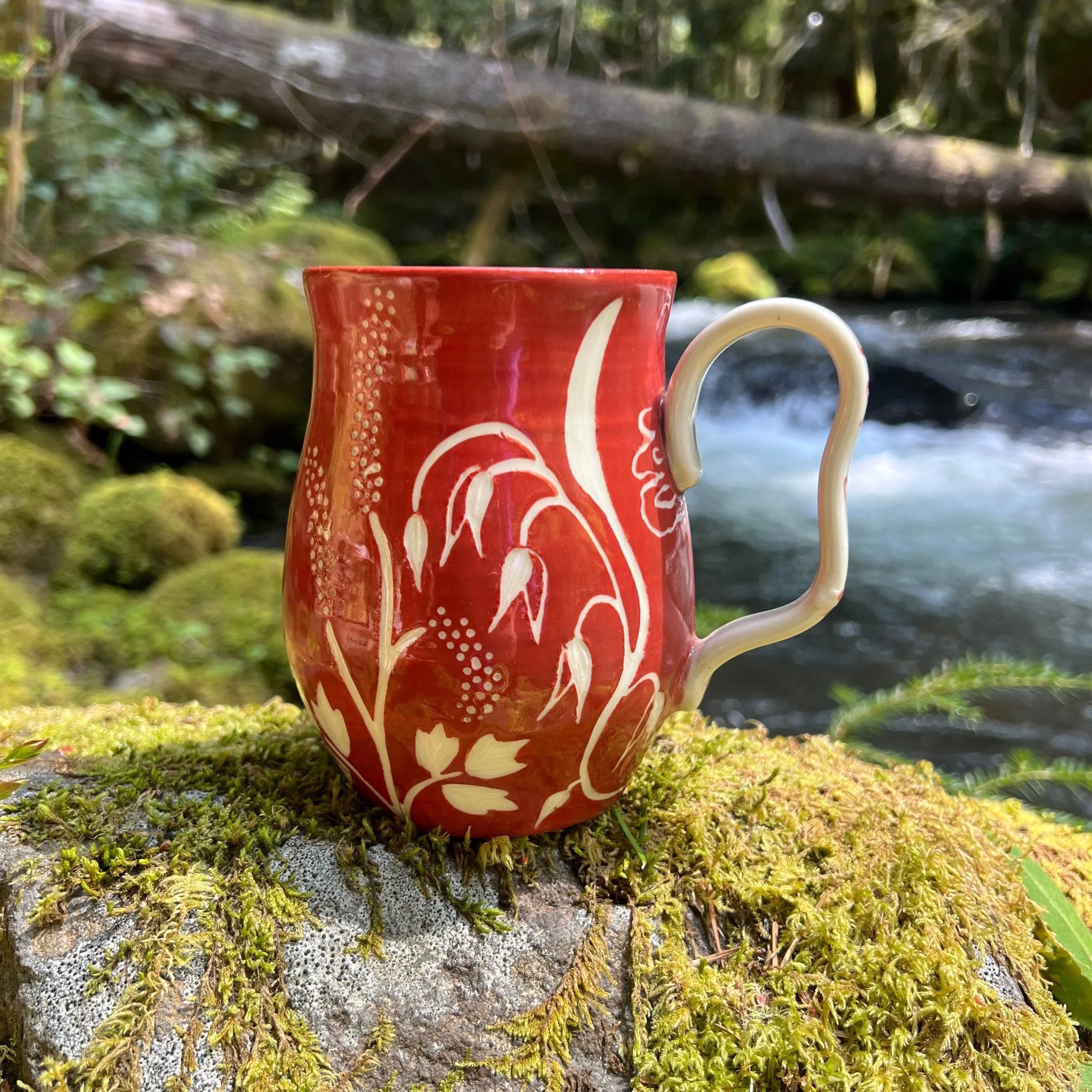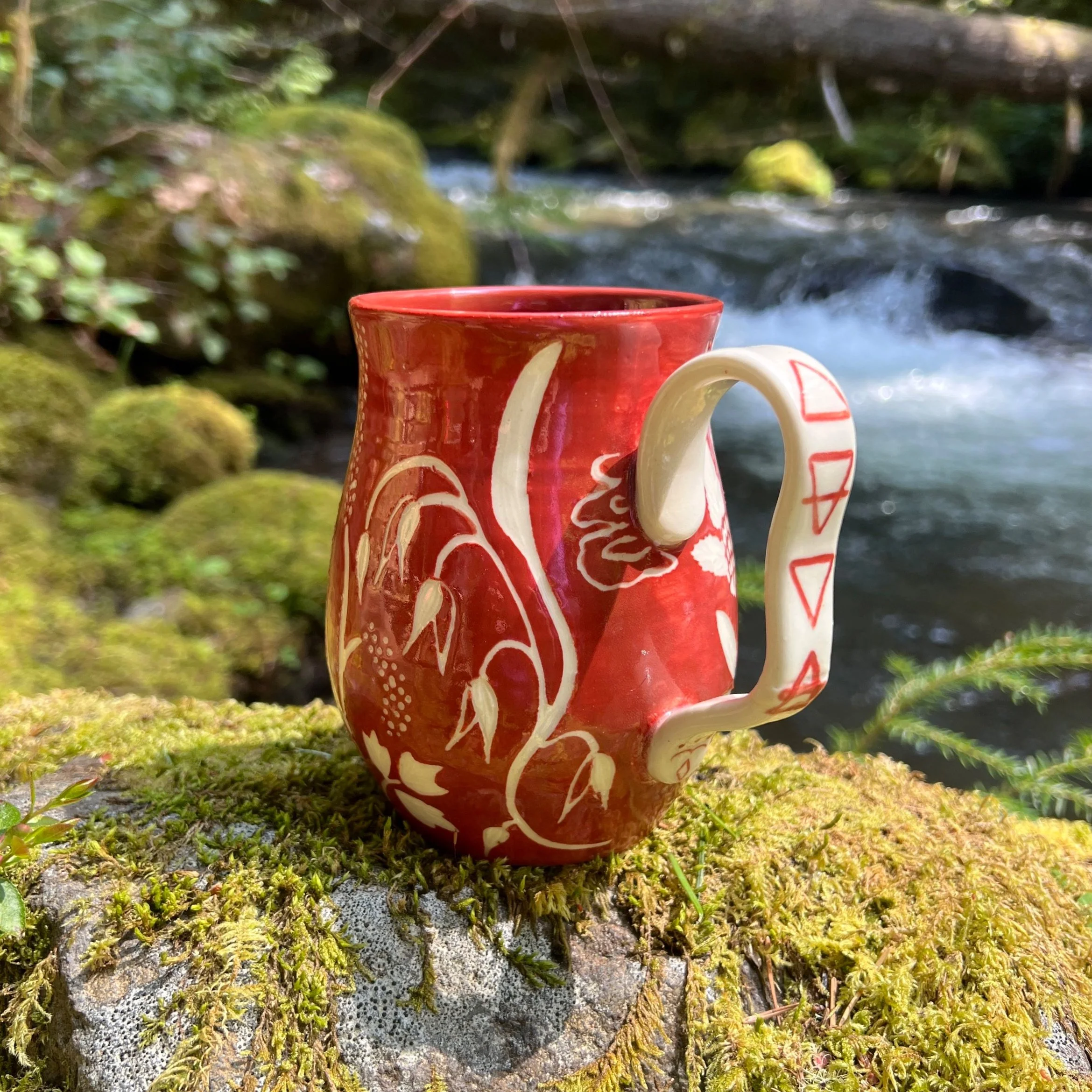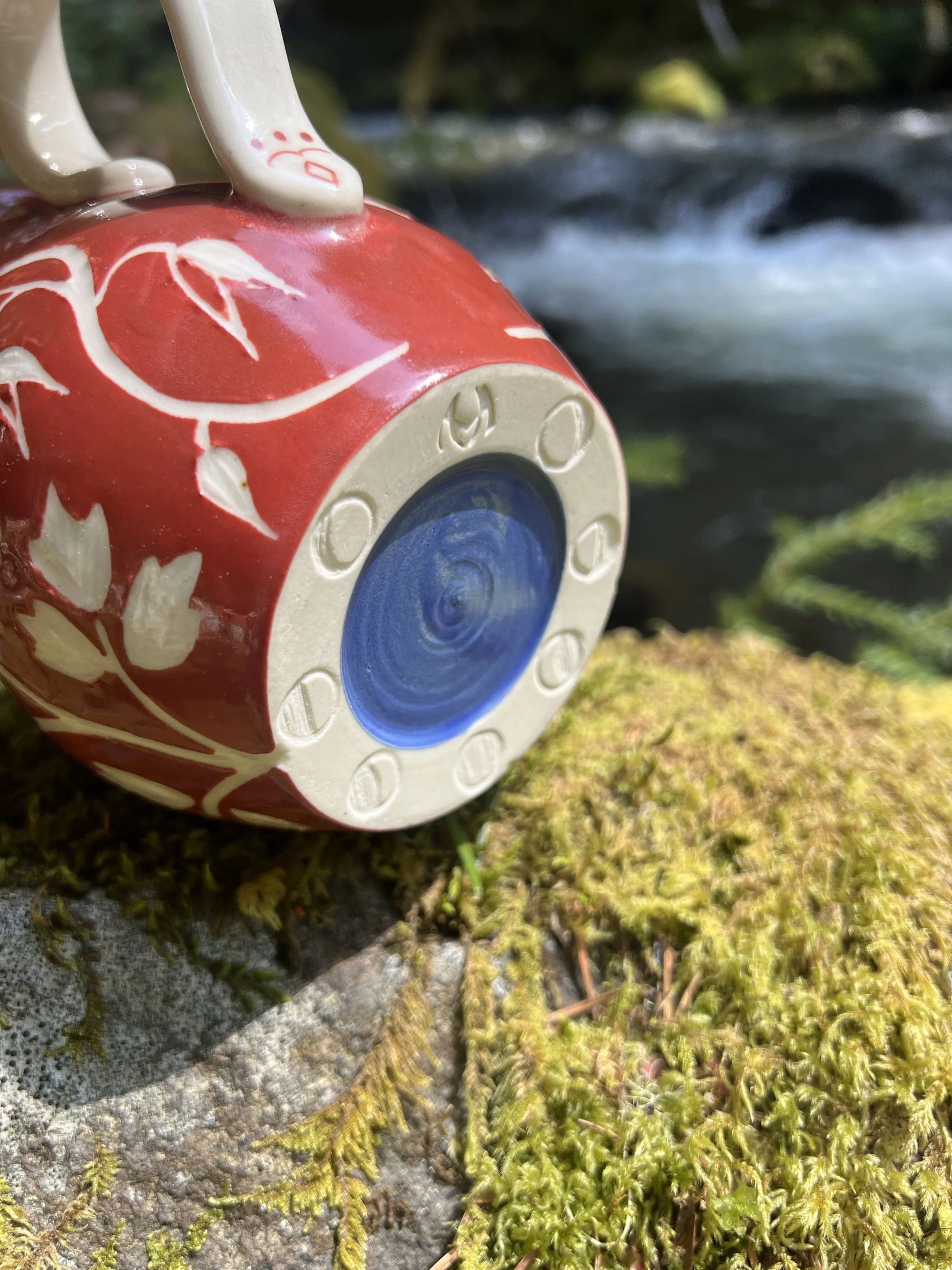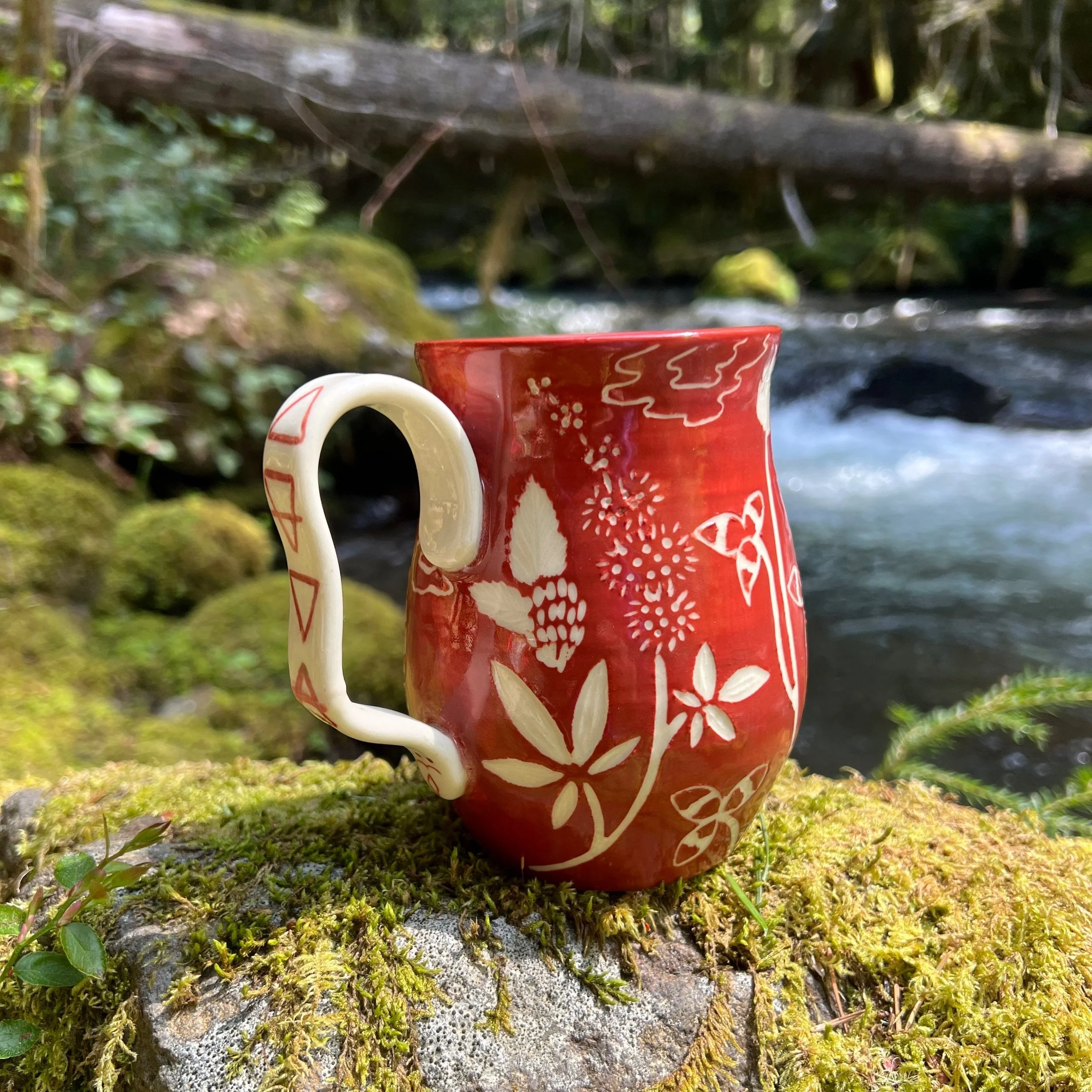 Each mug is thrown and trimmed by hand. Each design is hand carved by yours truly and there will be variations mug to mug. The details below are approximate since each mug is uniquely crafted.