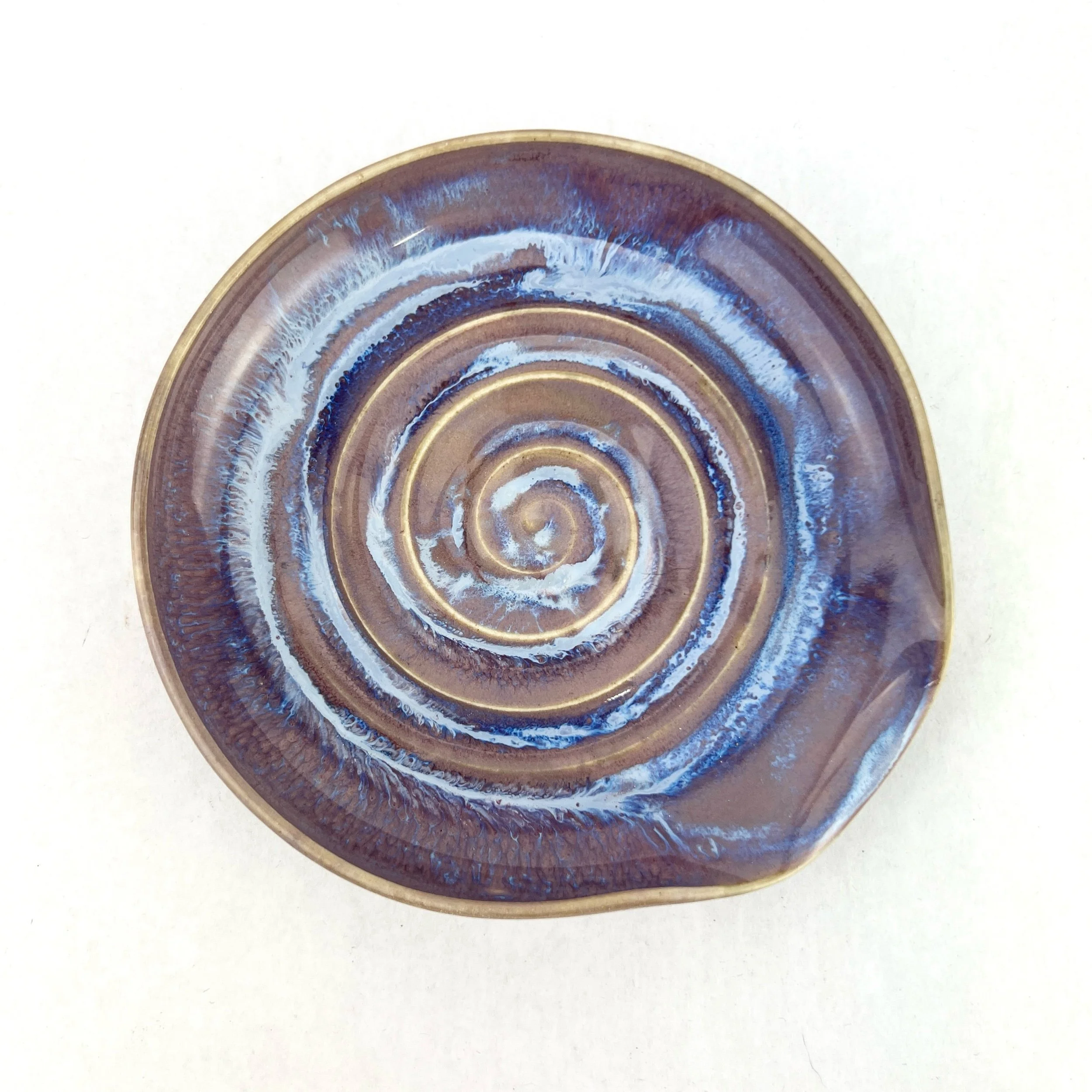 These spoon rests are thrown and trimmed by hand. Each design is intuitively created on each piece every time. The details below are approximate since each spoon rest is uniquely crafted.