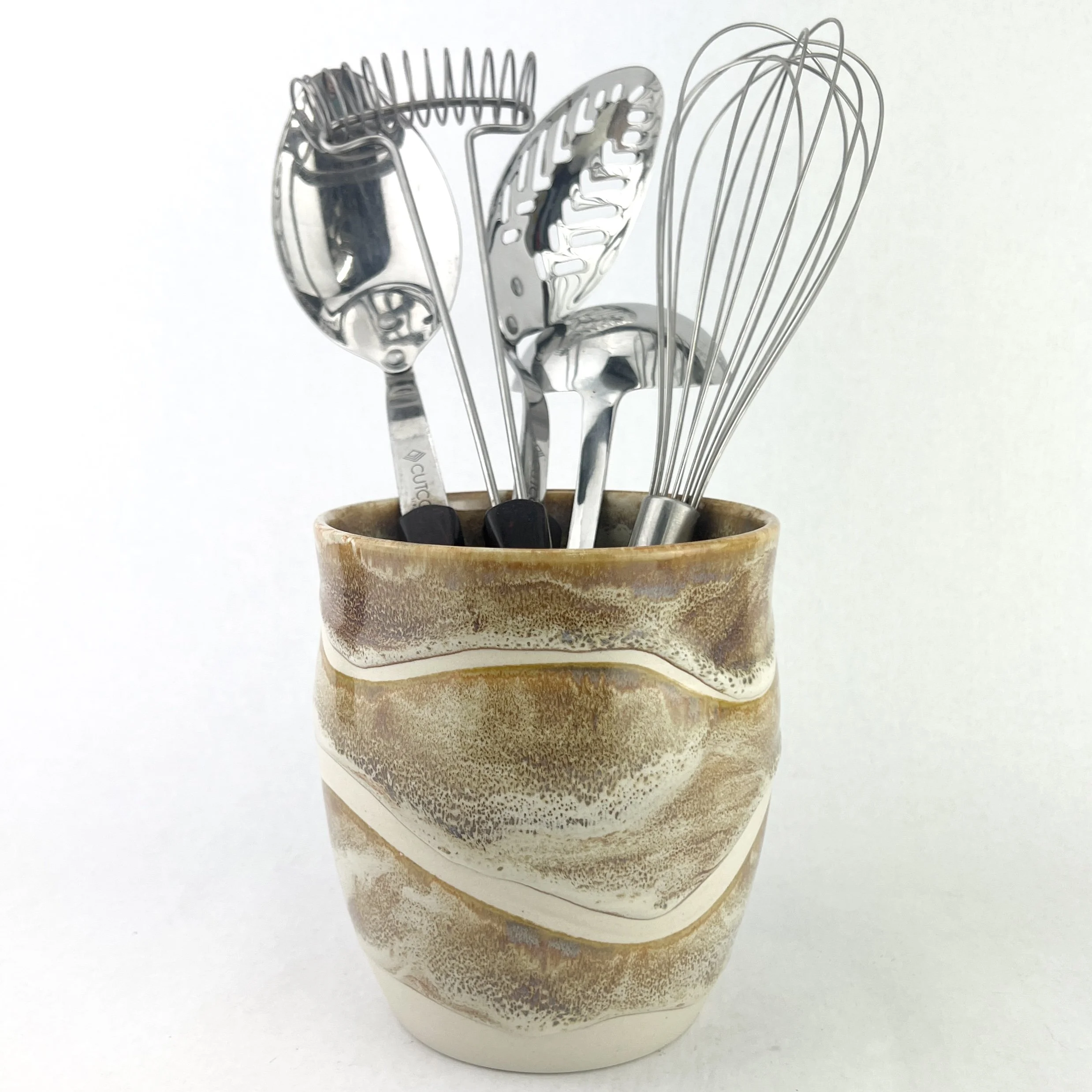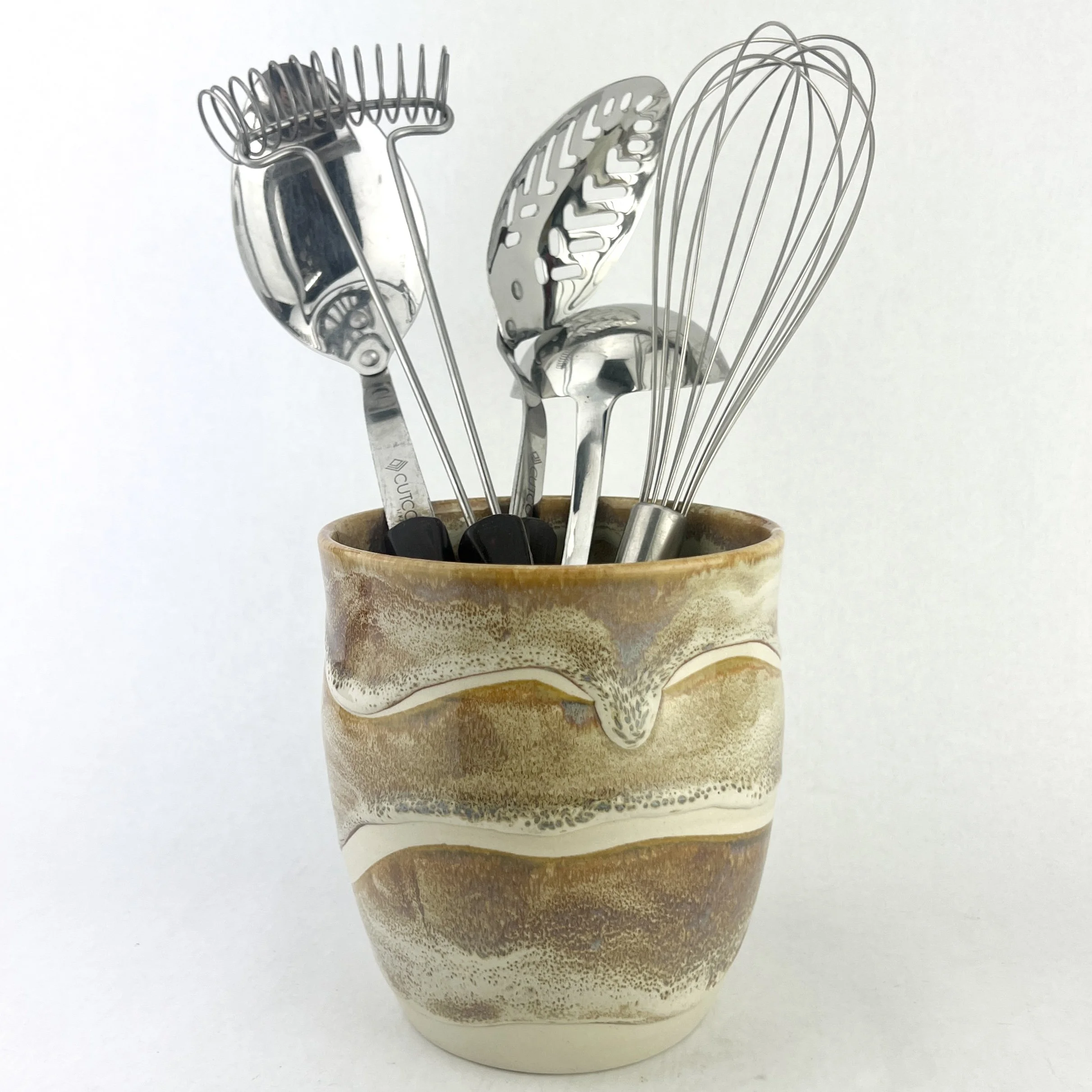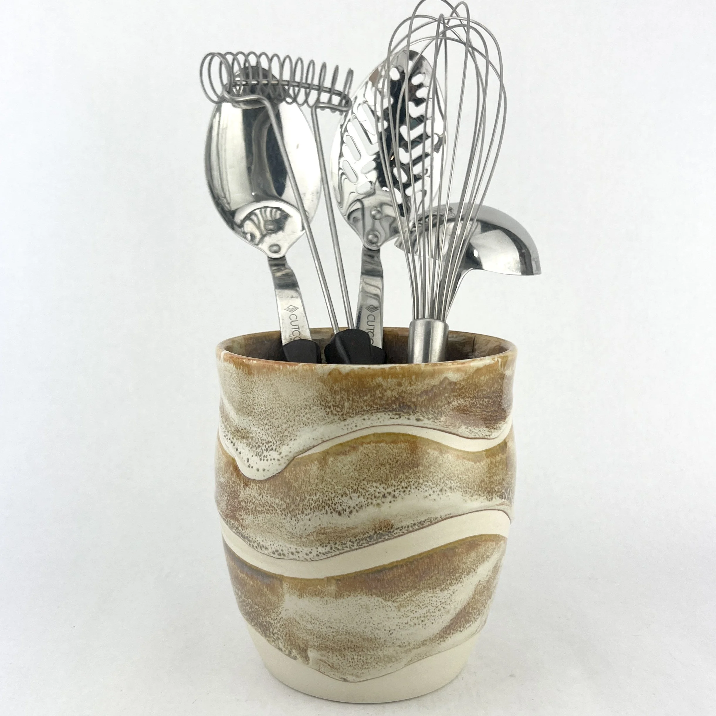 These utensil holders are thrown and trimmed by hand. The details below are approximate since each utensil holder is uniquely crafted.