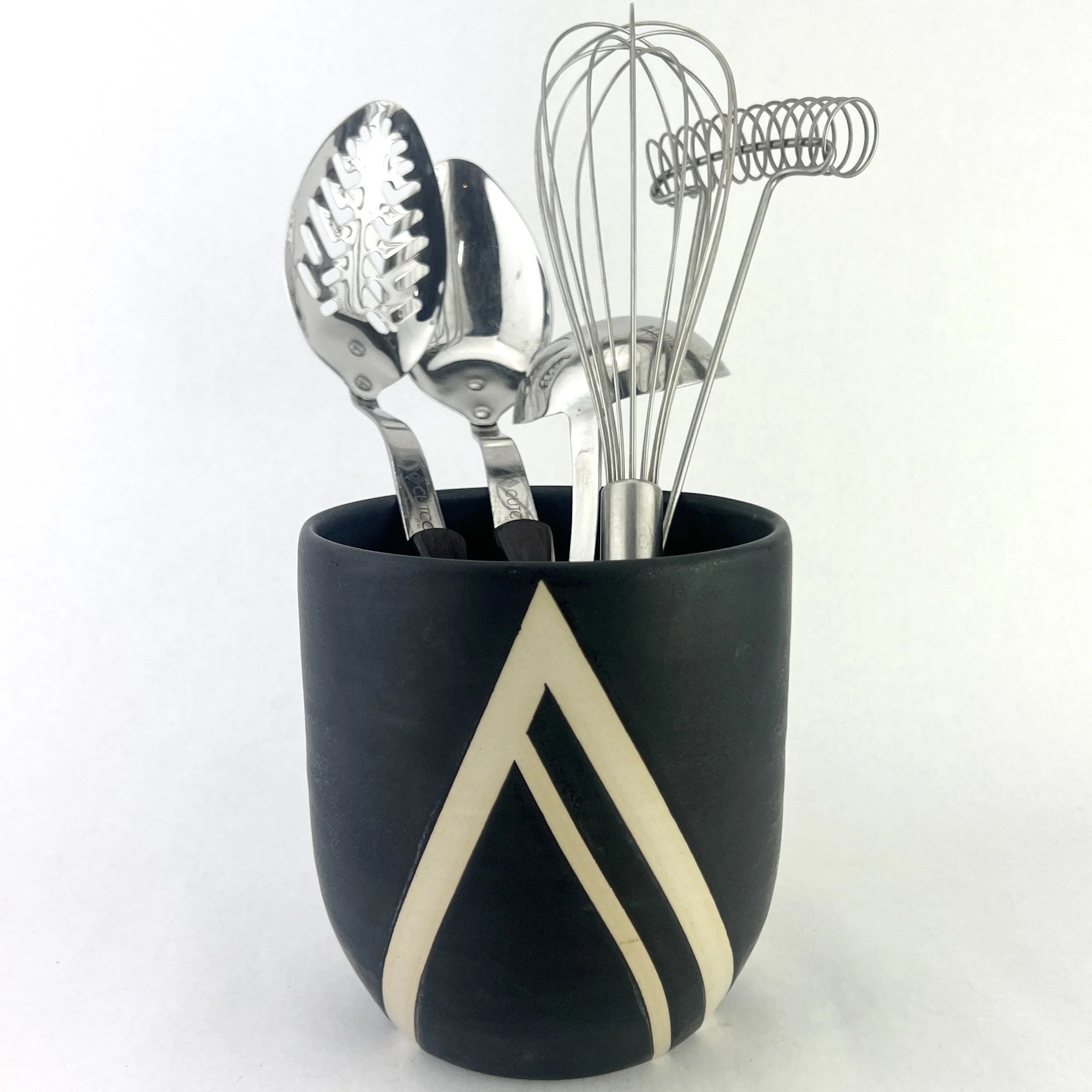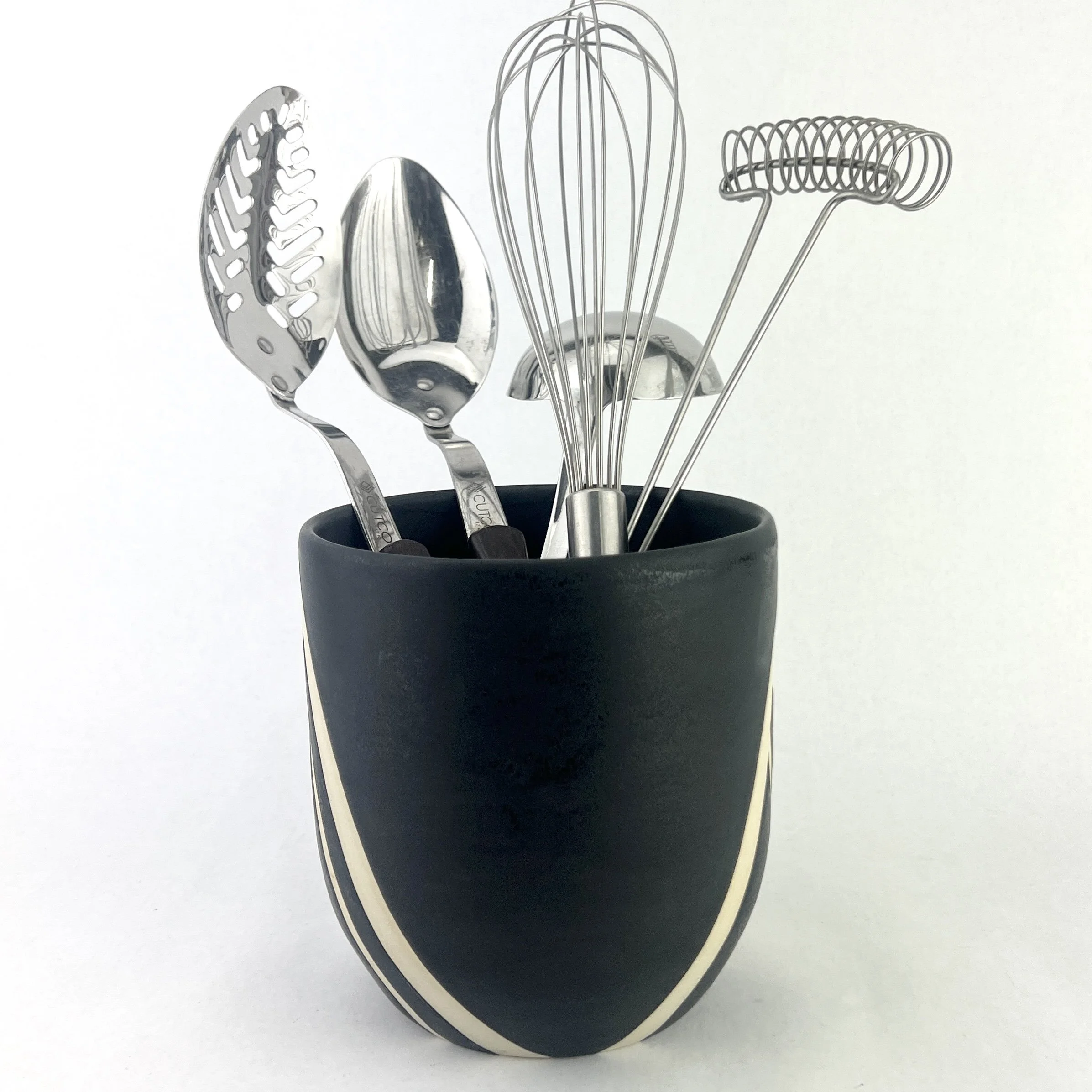 These utensil holders are thrown and trimmed by hand. The details below are approximate since each utensil holder is uniquely crafted.