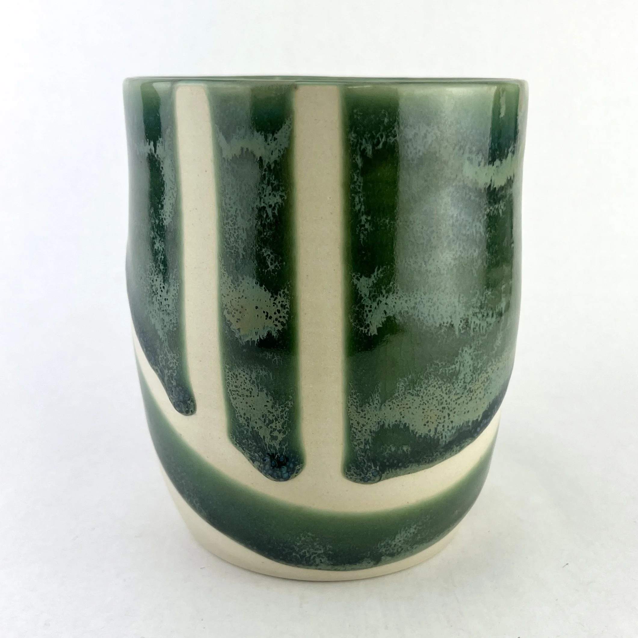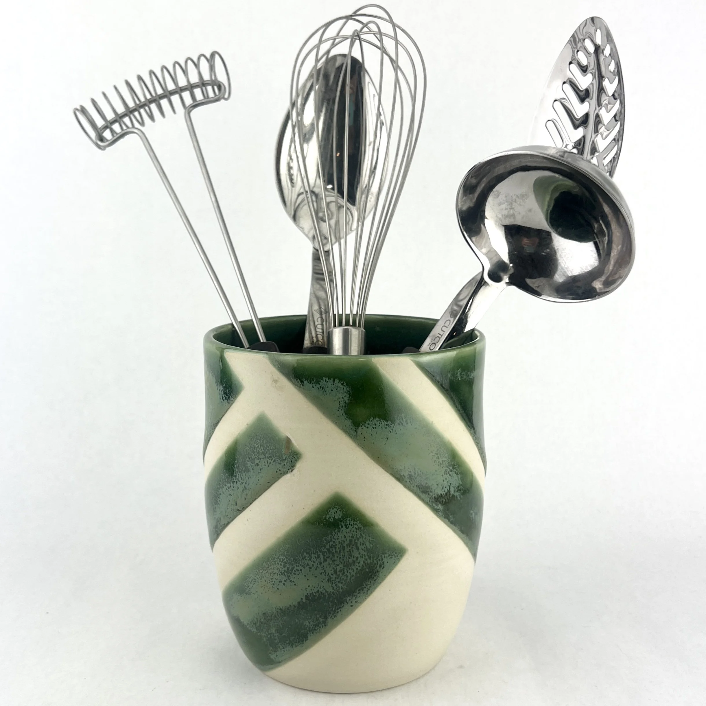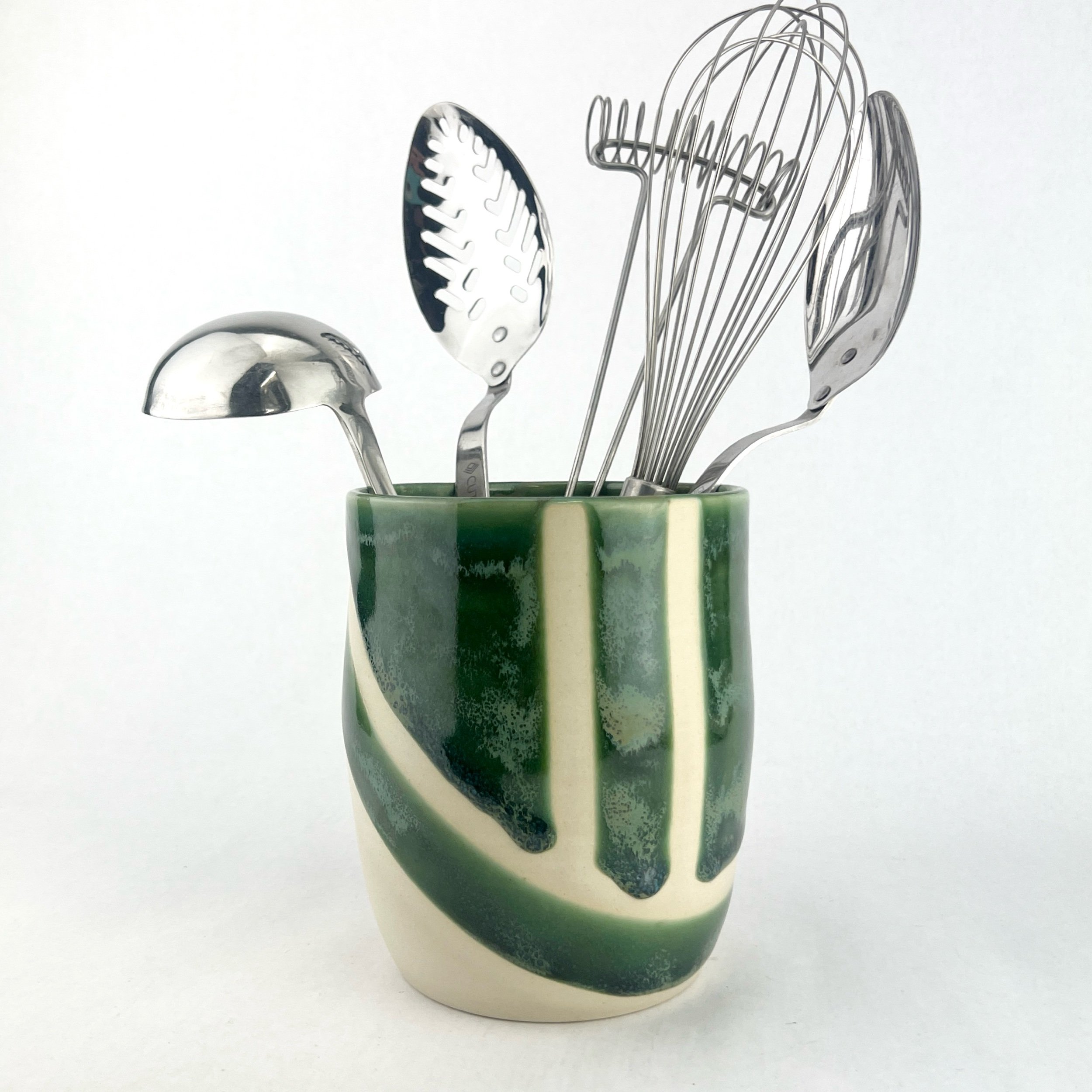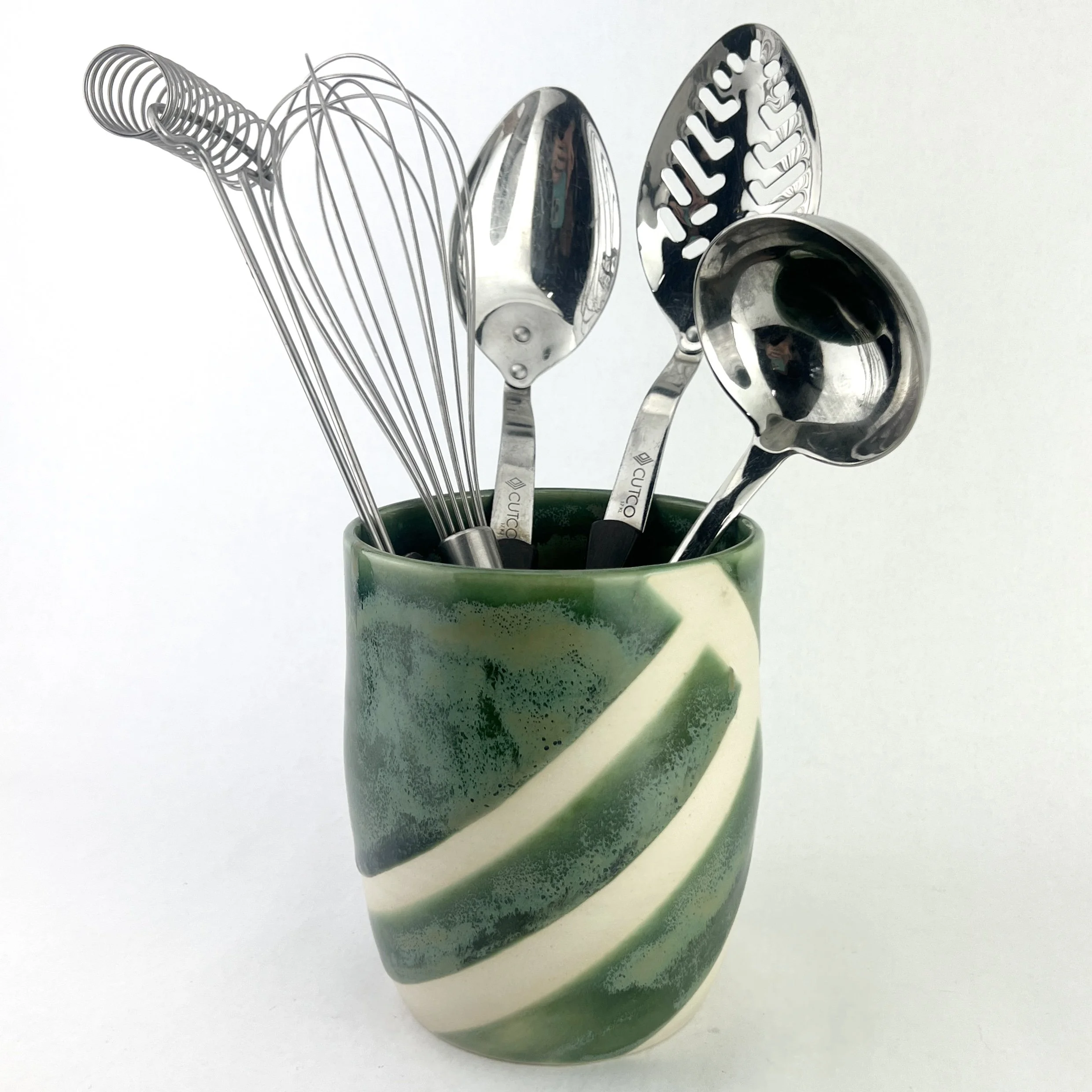 These utensil holders are thrown and trimmed by hand. The details below are approximate since each utensil holder is uniquely crafted.