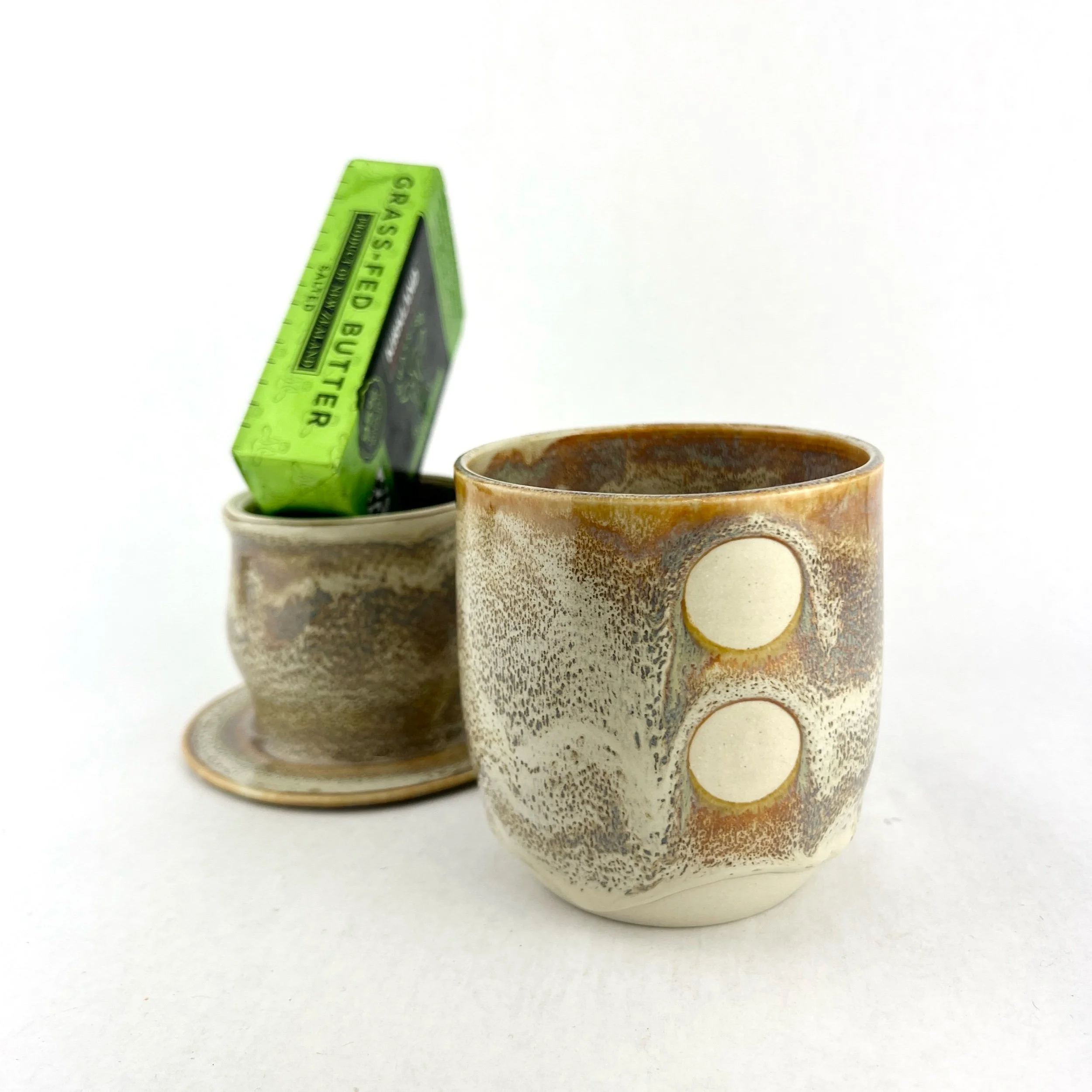 Each butter crock is thrown and trimmed by hand. Each design is intuitively created on each piece every time. The details below are approximate since each butter crock is uniquely crafted. I take additional steps at each part of the making process to ensure that the clay has the luxurious feel of a smooth river stone.