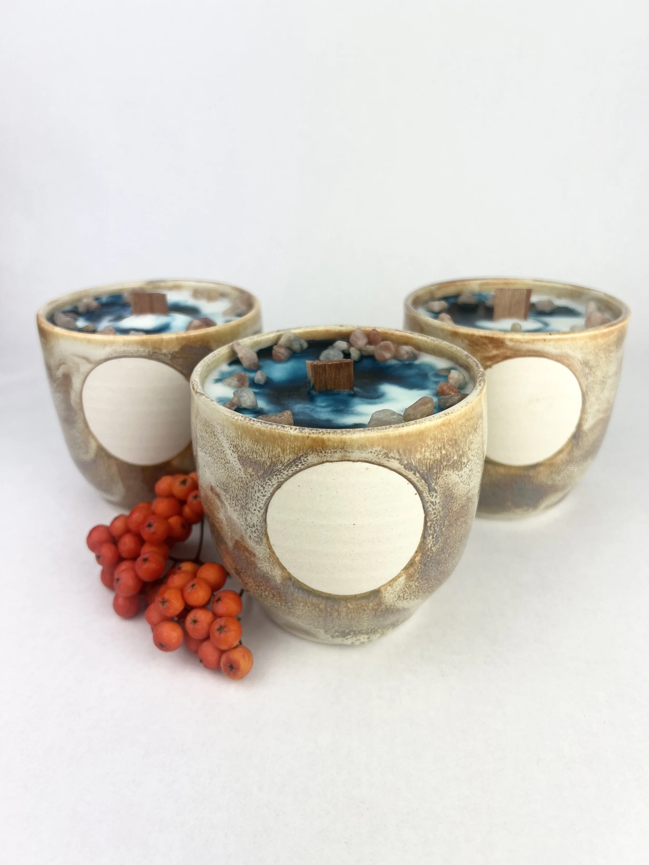 The containers are all thrown individually by hand, by Aby on the new moon. Then the candles are trimmed, burnished, and bisque fired under the waxing crescent and first quarter moon. They are then glazed and fired with a color pertaining to the new moon under the waxing gibbous moon.